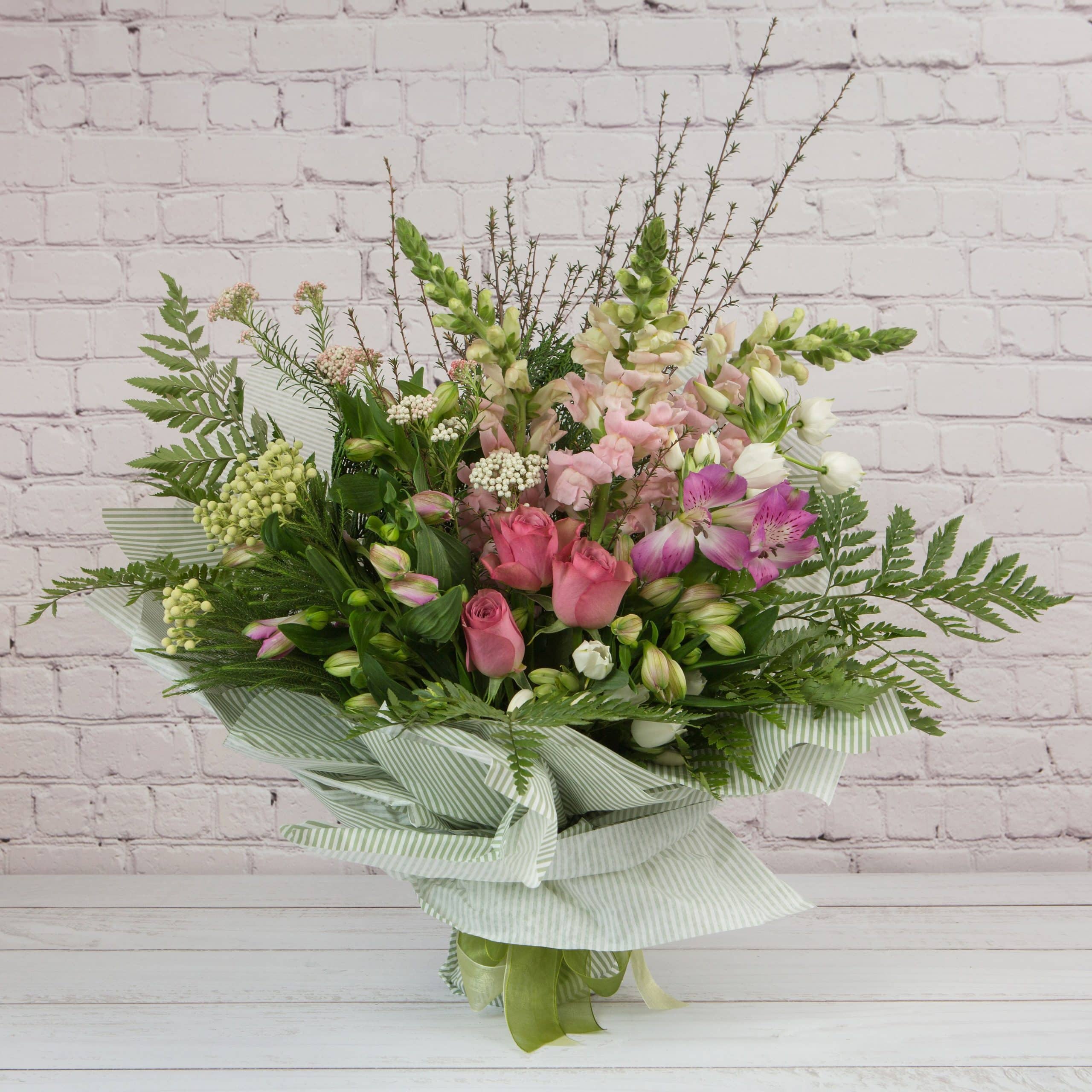 A selection of seasonal flowers designed in a bouquet style. Presented beautifully in tissue and paper with ribbon.